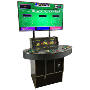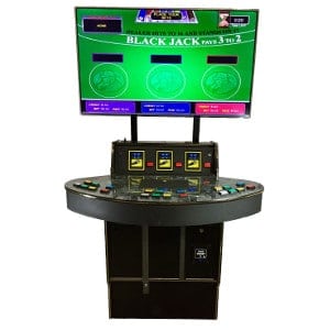 This 3 Player Blackjack Gaming System by Big Daddy is a complete system that is “Plug and Play” ready, featuring everyone’s favorite Blackjack card game. It has three different player stations for fun group play with each station featuring a Bill Acceptor, custom button set, and ticket printer.