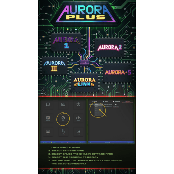 The Aurora PLUS by Jenka Lab is a versatile 5-in-1 Aurora multi-game that offers 5 COMPLETE Aurora games. Operators can select one of the five Aurora games in the settings. Each game is a different 5-in-1 multi-game, except Aurora Link is a 9-in-1 multi-game. Don’t miss out on this exclusive release from Jenka Lab. Order yours today and enjoy the ultimate gaming experience!
