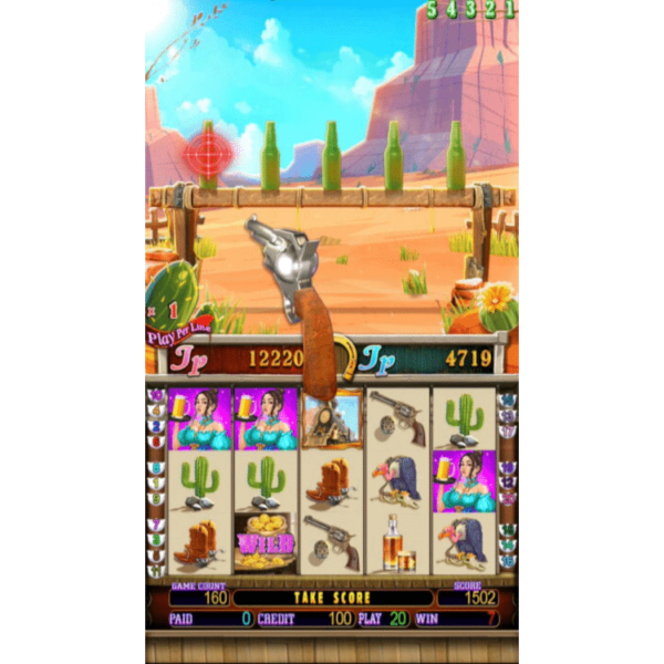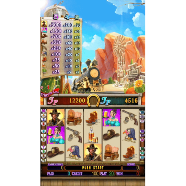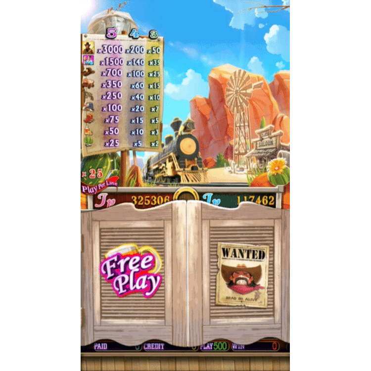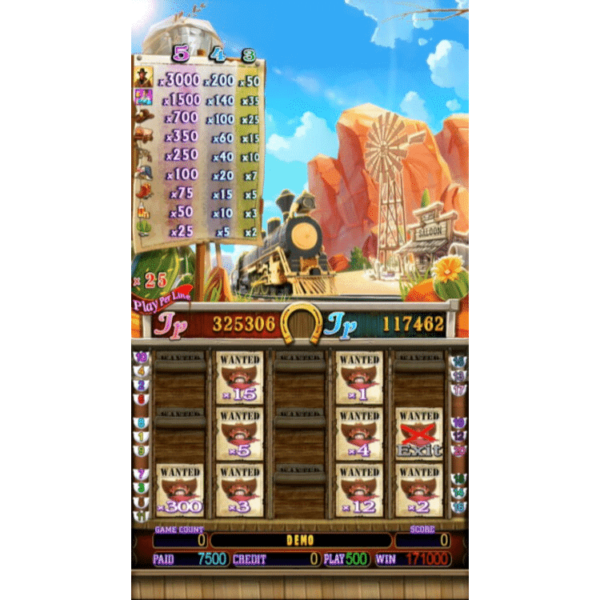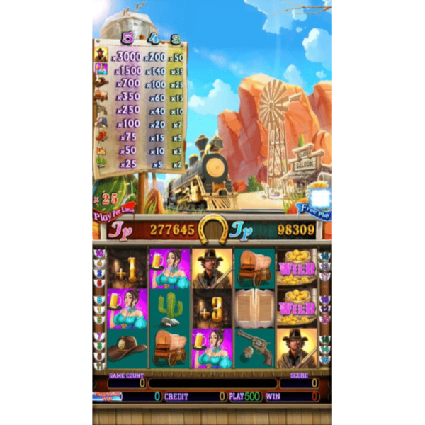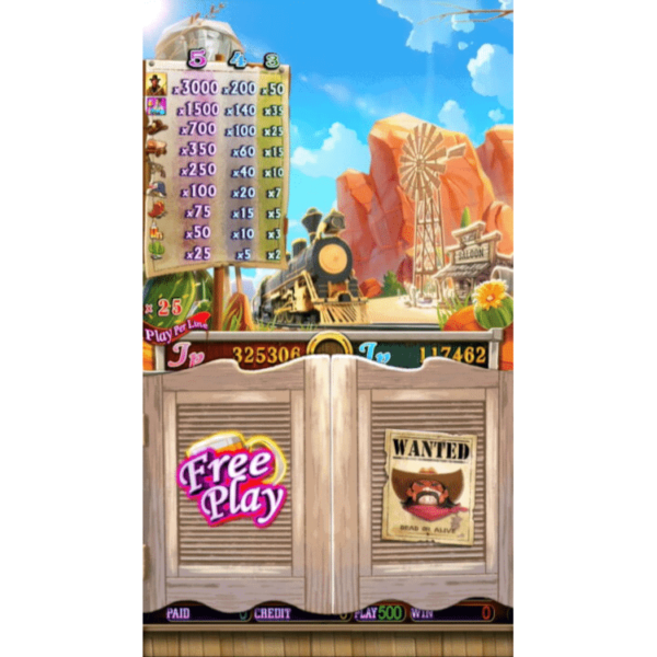 Wild Wild West by Subsino – Vertical Game is a 10-line or 20-line vertical game.  Three Train symbols on reels two, three, and four give players a chance to spin the Lucky Wheel.  Possible wins are up 1,000 times the play or two Jackpots!